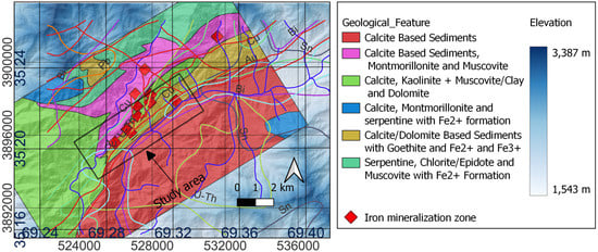 There are no prior public reports or studies available concerning local geological mapping in the vicinity of our study area. To generate a comprehensive local geology map for the study area, we have placed specific emphasis on highlighting the iron-bearing zone. This emphasis has been achieved through the application of remote sensing techniques, with a particular focus on satellite image processing. This approach involves analyzing and interpreting satellite imagery to gain valuable insights into the characteristics and distribution of iron-rich areas within this zone. A cloud-free level 1T ASTER image was downloaded from the U.S. Geological Survey Earth Resources Observation and Science Center (USGS EROS) “https://earthexplorer.usgs.gov (accessed on 20 October 2023)”. A band combination of 4, 6, 8 is used to visualize the geological formation, and the sediment boundaries are divided based on a color variation of the sediments. Using remote sensing techniques, we have identified and delineated lithological boundaries within the area of interest [,,]. Subsequently, we have refined and constrained these boundaries by utilizing a hyperspectral map from the work presented in [], allowing us to gain a more detailed understanding of the mineral composition in the study area (Figure 2). The magnetic surveying activities that have been conducted are denoted by the black-colored box on the map. The predominant mineral composition in this area is primarily linked to calcite and dolomite-based sediments. Additionally, there are occurrences of goethite and iron minerals represented by both Fe2+ and Fe3+.