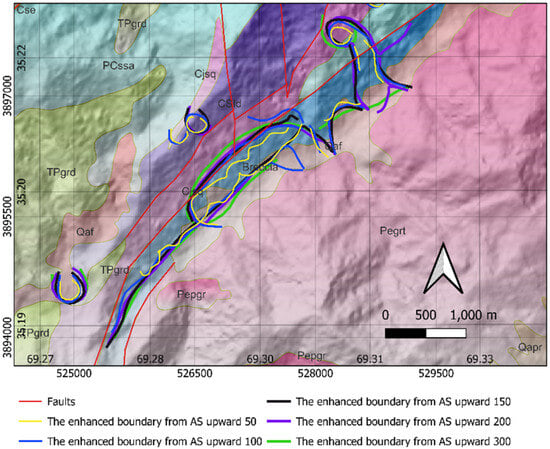 The analytical signal amplitude is useful for identifying underlying geological formations or resource potential and locations with large magnetic anomalies. By employing an upward continuation to reduce the influence of shallow sources and subsequently calculating the analytical signal amplitude, we enhance the ability to identify and interpret subsurface geological features and potential resource deposits from magnetic data. We calculate the analytical signal amplitude at each altitude once we have the upward continued magnetic data for various altitudes (e.g., 50, 100, 150, 200, and 300 units). Figure 4 illustrates the analytical signal amplitude applied on upward continued magnetic data. According to the regional geology map and analytical signal amplitude analysis, two prominent fault trends have been identified in the northeast to southwest direction. These fault trends are particularly distinct and noticeable in the analytical signal amplitude when it exceeds a threshold of upward of 300. In addition to the fault trends, multi-scale edge detection has also proven effective in enhancing the identification of other magnetic bodies located at the ends of the study area. The subsurface features, as identified through the analytical signal amplitude of the upward continuation data, are visually depicted in Figure 5.