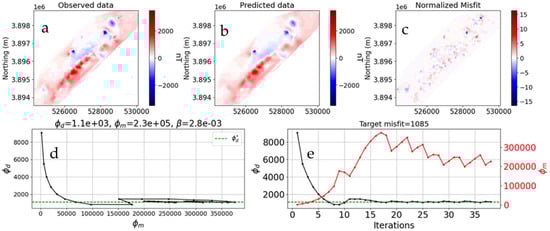 As a starting point, our initial assumption is that no remnant magnetization is present in the geological materials under investigation. Instead, we focus solely on induced magnetization to recover the susceptibility model. In the process of conducting magnetic susceptibility inversion, a crucial step involves the discretization of our study area into a well-structured grid. We employ a tensor mesh approach to achieve this, resulting in a three-dimensional grid with dimensions of m. This finely detailed mesh is instrumental in our efforts to invert the magnetic data effectively, allowing us to analyze and interpret magnetic susceptibility properties across the study area with precision and accuracy. Therefore, we used the reduced-to-pole magnetic data in Figure 3b as a fundamental dataset. We employed a target misfit of the number of data points with a , a standard error () = 95 nT plus 2% of the data range. After 38 iterations, the magnetic susceptibility inversion converged to this floor, achieving a stable model norm . The residual from the inversion with norm [0,1,1,1] with unitless normalization is shown in Figure 6a–c as [(observed data-predicted data)/standard deviation].