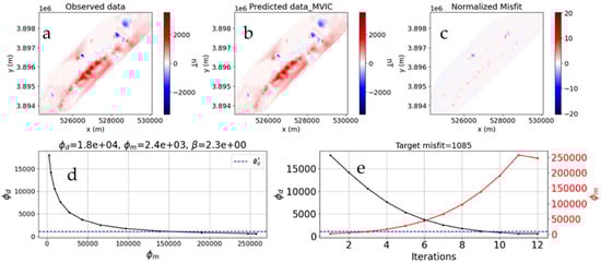 In the subsequent phase of our study, we expanded our analysis to incorporate the presence of remnant magnetization. To address this, we employed a specialized technique known as magnetization vector inversion to invert total magnetic intensity data, as seen in Figure 3a. This approach allowed us to account for induced and remnant magnetization, providing a more comprehensive and accurate assessment of the magnetic properties within our study area. Hence, we adopted a comprehensive approach by considering Cartesian and spherical coordinate frameworks. For the magnetization vector model, we used an octree mesh to discretize the study area, in contrast to our method for magnetic susceptibility inversion. A complex procedure available through SimPEG is employed to create an octree mesh. The predicted data at the location is then obtained by calculating the magnetic effect of each cell at the designated measurement point and adding up all of the effects of each cell. With dimensions of 120 120 120, this meshing approach was used to ensure a more accurate and focused study of the magnetization vectors. These dimensions were chosen to match the magnetic data’s spatial distribution closely. We set the regularization parameters for the Cartesian and spherical coordinate systems as [0000,0000,0000] magnetization vector inversion. We set a target misfit by aligning the number of data points with a , and a standard error () of 50 nT, plus 2% of the data range. Following 12 iterations, the magnetization vector inversion, utilizing the Cartesian formula, reached convergence at this threshold. As a result, it attained a stable model norm , as illustrated in Figure 7c.