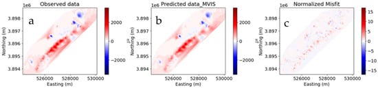 (a) Observed data (total magnetic intensity), (b) Predicted data calculated from the model norm [0000,0000,0000] in magnetization vector inversion using Spherical framework, (c) Normalized residual spatial distribution.