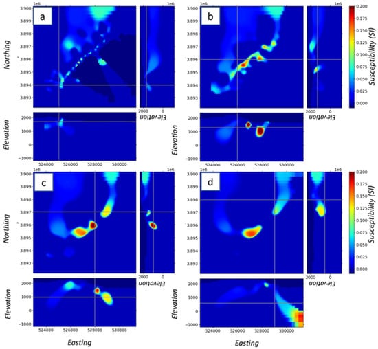 The horizontal and vertical slices of the recovered susceptibility model. (a) (x = 525,000, y = 3,894,000, and z = 1700), (b) (x = 526,500, y = 3,896,000, z = 1300), (c) (x = 528,200, y = 3,897,000, and z = 1000), and (d) (x = 529,500, y = 3,898,000, and z = 600). Gray lines along the x, y, and z axes in various panels represent the vertical and horizontal cross sections.