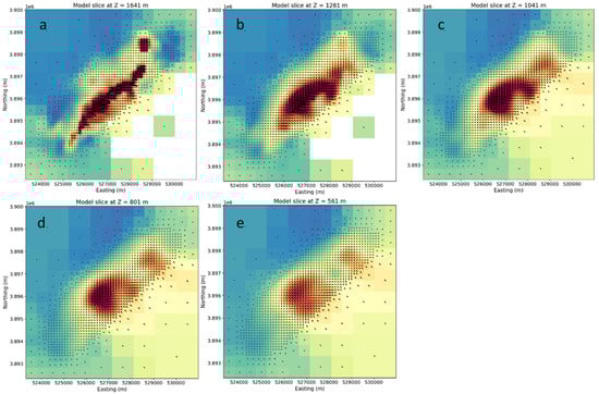 The horizontal slices at distinct depths within the subsurface of the study area. The slices are positioned at (a) z = 1641 m, (b) z = 1281 m, (c) z = 1041 m, (d) z = 801 m, and (e) z = 561 m.
