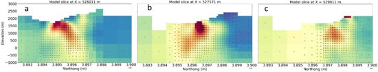 Three vertical slices along the east-west direction, at (a) y = 3,895,048 m, (b) y = 3,896,008 m, and (c) y = 3,897,208 m.