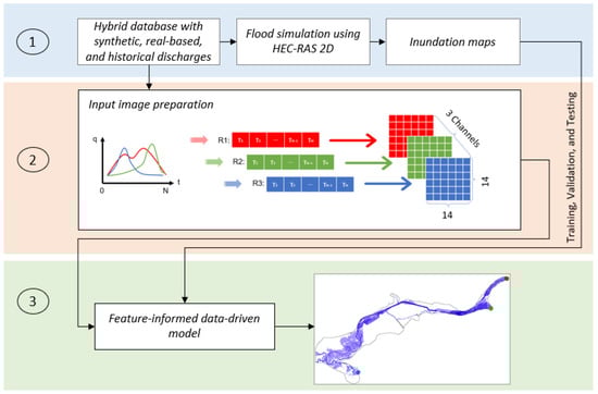 - As we follow an image-to-image strategy as a forecasting process, the time series of the hydrographs have to be converted so they can be presented to the feature-based data-driven model as images, which are later then translated into the corresponding inundation map. Therefore, the time series, are converted into a tensor with the size 14 × 14 × R, where R describes the numbers of hydrographs. In our study, R is equal to three. Nevertheless, other study areas may require different values of R. The 14 × 14 size, is the minimum size, necessary to make effective use of the convolutional operations. Smaller sizes lead to a 1 × 1 image size during the convolutional downsampling operations. Larger image sizes can be used without loss of accuracy or relevance of the modeling. For filling the image cells, the first timestep of the series is then placed into position 1 × 1 × 1, where the second timestep is placed into 1 × 2 × 1, and so on until the entire hydrograph is used up. A similar approach is used in the study of Kimura et al., 2019 [10];