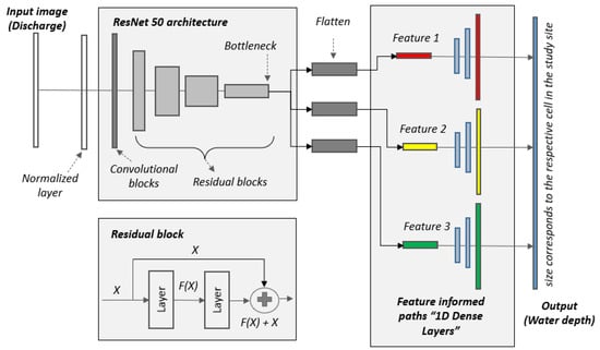 - The images from stage 2 are then fed into the feature-informed data-driven model, described in Section 2.2. This model translates these images into the upcoming inundation map. The architecture allows the integration of spatial and physical prior knowledge into the network. The model is trained, validated, and tested with the hybrid database from step 1, whereby the resolution of the prediction within the study area is given by the resolution of the respective hydrodynamic model used for generating the database. After training and validation, the data-driven model is able to replace the 2-dimensional flood model and can be used for real-time forecasting.