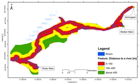 - feature 2: cells that are in a range of 150 to 400 m to a river;