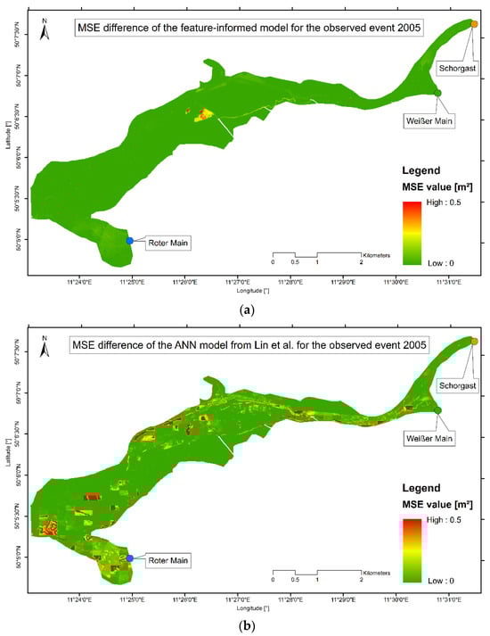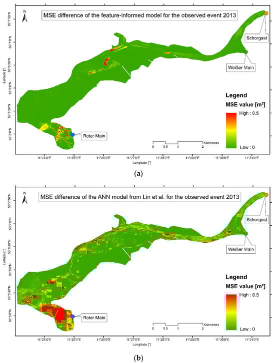 - The feature-informed architecture makes it possible to integrate additional knowledge about flooding into the model without providing an additional dataset. This not only enhances the prediction performance, since it also allows training on a standard computer, making such an application accessible to a wider range of users. The prediction performance on two observed test events showed only 0.11% and 2.14% of the cells forecasted have an MSE value larger than 0.2 m2, an improvement as compared to the work of Lin et al., 2020 [11] which reached values of 8.97% and 13.62%.