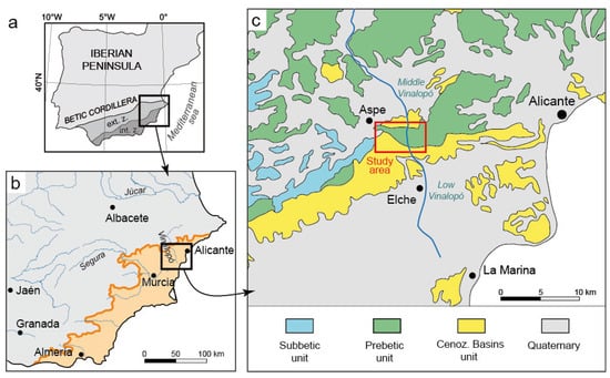 Location maps of the studied area. (a) Iberian Peninsula in the western Mediterranean and its relation with the Betic Cordillera. (b) Area of drylands environments in the southeast of the Iberian Peninsula where the precipitation is scarce more than 7 months at year (from Machado et al. [3]). (c) Geologic map of the eastern part of the Betic Cordillera showing the External Zones units (Subbetic and Prebetic) and the Cenozoic Basins unit. Note the location of the Vinalopó River. Minor Quaternary outcrops are not indicated, see Figure 2.