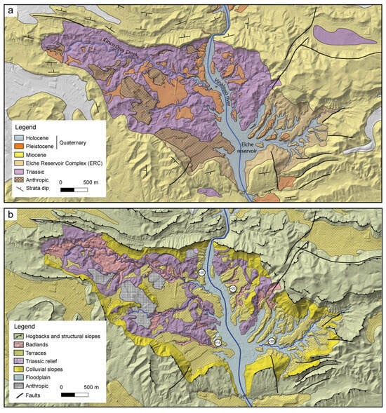 Two chronostratigraphic units can be distinguished within the Quaternary deposits: the youngest is a Holocene unit associated with the Vinalopó River and Elche reservoir located to the south, and the oldest is a Pleistocene unit that outcrops in the form of discontinuous terraces covering the paleo-relief left above after the incision of the Triassic and ERC units (Figure 2 and Figure 3). The most relevant evidence of such pre-Holocene deposits is found in the core of the antiform fold, despite there being small outcrops that are also identified beyond the study area (Figure 2a).