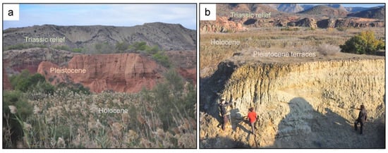 (a) Pleistocene deposits in Aljezares occupying the central part of the Quaternary basin in form of sedimentary rocks with vertical scarps and horizontal stratification. In the foreground, riparian vegetation grows on Holocene deposits. In the background, the Triassic relief is observed. (b) Detail of the flat tops of Pleistocene terraces.