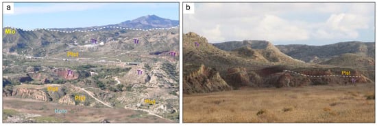(a) Panoramic view of main geomorphological zones. The badlands on Triassic formations (Tr) appear dispersed between the Pleistocene flat terraces (Plst). The white striped line shows the limit of the Aljezares anticline formed by the Miocene units (Mio), with the foreground Betic relief. Notice the high anthropic interventions over Triassic formation, with exploitation of resources like clays and dolomite ballast. Additionally, the trace of the high-speed train line is observed in the center of the image. (b) Colluvial slopes connecting the Triassic highs with Pleistocene deposits in the center of the basin.