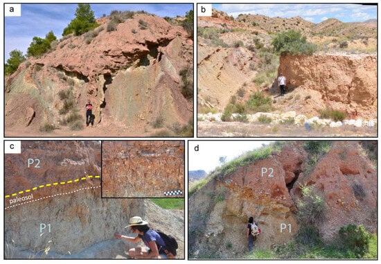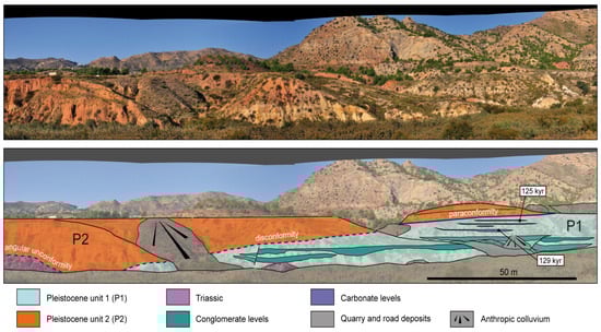 Pleistocene deposits crop out above the angular unconformity that affects the Triassic and ERC units. The unconformity constitutes a sharp paleo-relief, with deeper areas located close to the present day location of the Vinalopó River, Elche reservoir and Cinco Ojos Creek (Figure 2). Therein, Pleistocene horizontal strata reach up to 16 m of thickness and onlap the irregular unconformity (Figure 5a). Through the boundaries of the basin, low-angle dipping strata gradually lose thickness and pinch out (Figure 5b). The central part of the basin is eroded by the present course of the Vinalopó River, leaving visible and accessible outcrops where the deposits have been described and the stratigraphic panel has been made (Figure 6). Within the Pleistocene deposits, two units can be distinguished (P1 and P2), limited by a minor unconformity described as a paraconformity, which is linked to paleosol development (Figure 5c). Conversely, it shows an erosive disconformity in the central zone (Figure 5d).