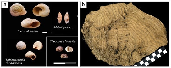 (a) Gastropods observed in the Pleistocene deposits of Aljezares Quaternary basin. Scale is 2 cm. (b) Stromatolitic type lamination in domical tufa sample. The concentric lamination growth produced by microbial communities can be observed. Scale in cm.