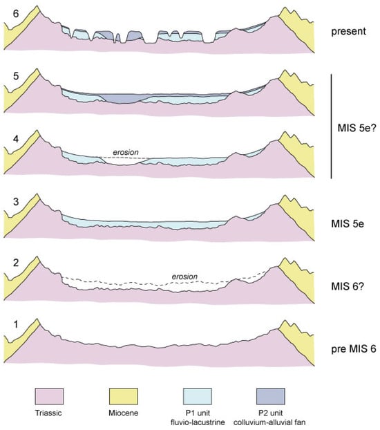 Stage 4–5: It starts with an unconformity on the P1 unit. This represents a paraconformity with depositional hiatus, although locally it has erosive features as indicated by the central location of the disconformity and angular unconformity. Over the unconformity, the sedimentation of unit P2 occurs, ending with a pediment-like geomorphological surface related to the colluvial slopes and the Pleistocene terraces described in the geomorphological analysis, located at T + 18/20. This top level of filling is compatible with the highstand that characterizes the last interglacial period [21], so the P2 unit is likely to be related to small eustatic oscillations or tectonic processes, but within MIS 5. Therefore, the P2 unit could represent a minor rupture during the Pleistocene filling, with a brief break in sedimentation and a local entrenchment in a west-east direction, thus dismantling the Triassic materials located in the west part of the Aljezares basin.