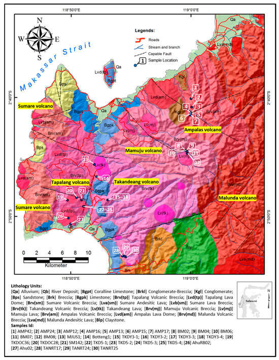 Geological map and sample locations in the vicinity of Mamuju, Indonesia (modified from [,,]).