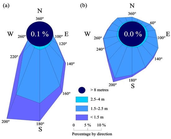 Plots of average directions and speeds of swells as recorded coming from the northwest Tuamotu region—meteorological station of Takaroa Atoll—from 1981 to 2010. (a) Winter season (June, July, August); (b) summer season (December, January, February). Adapted from [75].