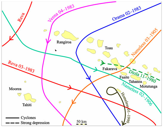 Extreme marine wave hazard events have been poorly documented in the Tuamotu region during historical times; the observational period spans approximately the last 200 years. Based on the analysis of reef sediment archives, cyclogenesis seems to have been of a greater magnitude during the past than during the last century [63], especially during the Little Ice Age in the tropical Pacific [76]. Only about 24 cyclones have been recorded in the Tuamotu for the past 192 years, between 1822 and 2014. Since the beginning of the 20th century, the northwestern Tuamotu region has been hit by six cyclones and a strong tropical depression. As with other Tuamotu islands, Fakarava is rarely impacted by tropical cyclones and depressions [77] (Figure 4). The last tropical cyclone that affected Fakarava was Orama (category 3: wind speed from 178 to 210 km/h; wave heights from 2.7 to 3.7 m) in February 1983. Over periods of several centuries, the number of cyclonic events in northwest Tuamotu have probably not exceeded 2–3 per century (Canavesio, 2014). Gaps of longer than 100 years are not uncommon between extreme wave events. Cyclone hazard records reveal a 50-year return period for waves exceeding 12 m high [13]. Distant-source storm swells are also active in Tuamotu, generated from the northern or southern Pacific high latitudes [14]. As it is subtidally positioned, the reef flat zone from the western rim sides at Fakarava can be easily overwashed by strong waves, thus facilitating great water influx in the lagoon. The sea level could probably rise up to 2.50 m in the lagoon, as observed on Makemo Atoll [14]. Fakarava is also known to experience the effects of low to moderate climate events, such as tropical lows, able to generate strong swells. At Fakarava, such events have resulted in shoreline erosion and retreat [15].