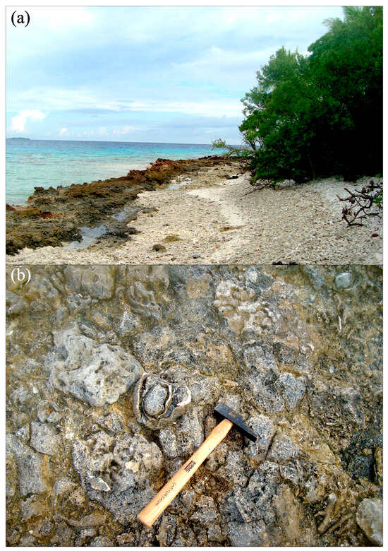 The selected leeward sites (B1 and B2) are located at the mid part of the western, partly submerged reef-rim (Figure 1b,d,e), dotted with about a dozen moving, sandy, non-vegetated to relatively stable, vegetated islets at its innermost border. This zone also displays large, discontinuous rubble sheets, locally consolidated as conglomerate pavements (Figure 5). Two islets were selected to reconstruct their subsurface lithology and stratigraphy, respectively referred to as Motu Topikite (Site B1), at 16°21′53.14″ S–145°41′09.52″ W and Motu Otekofai (Site B2) at 16°25′22.67″ S–145°38′13.71″ W. Motu Topikite is crescent-shaped, about 50 m long by 25 m large, about 2000 m2 in surface area, sparsely vegetated and culminating at approximately 1.20 m above pmsl. It is bordered by a 90 m long, 55 m wide conglomerate platform on its ocean-facing side and rests on a reef flat surface in its back face. Motu Otekofai is about 150 m long and 110 m wide, 15,070 m2 in surface area. It reaches 1 m in maximum elevation. Densely vegetated, it is covered by forest species—Cocos nucifera, Calophyllum inophyllum, Pandanus sp., Guettarda speciosa—together with low-growing Heliotropium foertherianum. One excavation was dug by hand using pick and shovel through the center of each islet, down to sea level (Figure 1b,d,e).