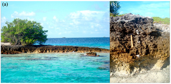 Lagoonal reef patch C2, Fakarava Atoll; see Figure 1g for location. (a) View of its northeastern end, showing the conglomerate pavement, up to 1 m thick, serving as an antecedent substrate for vegetated, sandy sheets; (b) section of the conglomerate platform—thickness: 1.30 m.