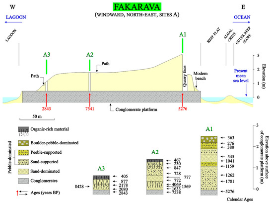 The selected windward site (see Area A, Figure 1b) is located in the east–northeast portion of the about 50 km long, continuous motu occupying the total area of the eastern side of the atoll reef rim (Figure 1c). Behind a 55 m wide reef flat zone, the emerged motu stretches over 245 m from the ocean-facing shoreline to the lagoon margin, from 16°10′48″ S–145°34′05″ W to 16°10′52″ S–145°34′13″ W. Islet topography is typified by a 20 m wide rubble ridge with steep (up to 40°) faces seawards, about 3 m high relative to pmsl. This overlies a conglomerate outcrop, approximately 20–25 m in width. Behind the ridge, there is a gentle-dipping bench. The bench elevation decreases regularly to reach 1.15 m at the lagoonal margin. The bench ends into a less than 20° sloping beach, about 4–5 m wide, resting on an about 10 m wide conglomerate platform. The motu is densely vegetated. Sediment sequence analysis and sample collection were conducted at three subsites: from the face of the open quarry (Site A1) at the ocean-facing islet side and from two vertical excavations dug using backhoe, respectively, through the middle (Site A2) and inner (Site A3) parts of the bench (Figure 1c).