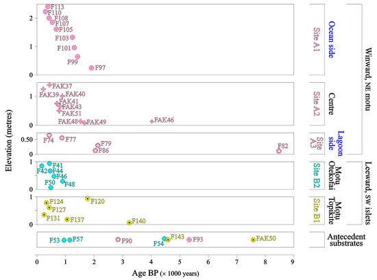 In most cases, in the excavated unconsolidated depositional units, there is a common decreasing trend in the age from base upwards, consistent with stratigraphy (Figure 11). In the northeastern, windward motu sites, clast deposition appears to have started from about 2200 (F86A: 2171 ± 26 yr BP) or 2000 years ago (F86B: 2080 ± 10 yr BP) to 1600 years ago (FAK49: 1633 ± 15 yr BP; F97: 1781 ± 8 yr BP) and to have finished around 400–200 years ago (F113: 363 ± 5 yr BP; F74: 405 ± 3 yr BP; FAK39: 230 ± 8 yr BP). The average time lag between the base and top of each sequence, as a reference of the vertical accretion duration, can be estimated at between 1200 and 2000 years (Figure 11), considering yjr possible phases of islet reshaping. At the lowermost parts of the motu deposits, coral samples as old as 4000 (FAK46: 4069 ± 17 yr BP), 5000 (F93: 5276 ± 21 yr BP), and 8000 years (F82: 8428 ± 57 yr BP) were found in the three excavations. These are interpreted as resulting from intense reworking during the early phases of motu accretion, thus allowing for clasts supplied from older stocks to be interbedded with more recent ones.
