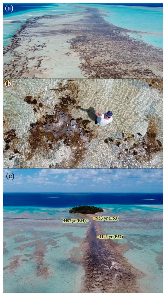 The most striking feature is the occurrence of continuous conglomerate bands along the leeward, southeast, innermost reef-rim zone at a constant distance of 900 to 100 m behind the reef front line. By contrast, conglomerate networks are weakly developed along the outermost rim zones, just forming localized, sub-circular to elongated patchy units, about 30 to 100 m wide and up to 250 m long (Figure 5). Field observations and the analysis of the drone images of the conglomerate networks of the reef area considered revealed that these pavements and adjacent reef flats, emplaced during the sea level high stand, between 4531 ± 16 yr BP (F143) and 4406 yr BP (F54) are being severely eroded (Figure 12a–c and Figure 13). Similar conglomeratic alignments are observed along the leeward, western reef-rims of a number of nearby atolls, including Toau, Faaite, Tahanea, and Motutunga. Their location may reflect the limit of the transport of pebble-sized clasts by non-cyclonic, storm surges.