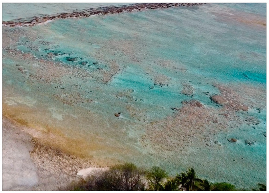 Two reef patches, the emerged tops of which are covered by vegetated (wooded) islets and identified as Reef Patch A (Site C1) and Reef Patch E (Site C2), were selected from the lagoon (Figure 1b,f,g). Densely vegetated, Reef Patch A (16°14′46.25″ S–145°42′30.67″ W), known as Motu Hakono, is about 30,000 m2 in surface area (Figure 6). Sparsely vegetated, Reef Patch E (16°17′11.69″ S–145°38′22.65″ W) does not exceed 3000 m2. Both are overtopped by discontinuous conglomerate platforms, averaging 0.40 m in thickness, and locally reaching about 1.10 m in maximum thickness. Their maximum elevation ranges between 1.0 and 1.30 m (Figure 7).