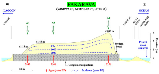 In the windward, northeast motu system, the clast age distributional patterns suggest that the three cross-sections have begun to emplace practically simultaneously, within a relatively short time lag of about 400 years (Figure 9). The sequence close to the oceanward shoreline (Site A1) commenced depositing around 1800 years ago (F97: 1781 ± 8 yr BP). Islet initiation at the innermost sites occurred at about 1600 yr BP (motu centre, Site A2, FAK49: 1633 ± 15 yr BP; FAK48: 1569 ± 10 yr BP) and 2200–2000 yr BP (lagoon margin, Site A3, F86A: 2080 ± 10 yr BP; F86B: 2171 ± 26 yr BP). The age comparison between the uppermost layers of the lagoon-facing section and of the outermost ones gives support to the idea that the deposits of the lagoon margin have remained stable over the last 400 years (Site A3, Sample F74: 405 ± 3 yr BP), while the ocean-facing margin as well as the central part of the motu bench have suffered intense reshaping over the two last centuries (Site A1, F110: 276 ± 2 yr BP; Site A2, FAK39: 230 ± 8 yr BP). Finally, the timeline of the distributional pattern reflects an accretion that would have started approximately 2000 yr ago and remained active until about 200 yr BP (Figure 14), probably prior to the relative motu stabilization by sustainable vegetation establishment.