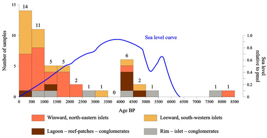 Radiometric dating of displaced skeletal clasts for reconstructing atoll islet depositional histories were discussed previously [19,48,58,59,60,69]. Due to time uncertainty on clast deposition and stabilization, islet chronologies are regarded as relative, not absolute. Coral clasts may have been subjected to successive phases of reworking and deposition. This is clearly evidenced by a number of age inversions in the cross-sections (Figures 9 and 10). However, islet chronologies are assumed to be consistent, since most dated samples occupy a stratigraphic position within the cross-sections and conglomerates, which agrees with their age. Samples tend to be younger closer to the top and older closer to the bottom. In these sites, the youngest ages obtained are regarded to be closer to the time of definitive stabilization of the relevant islet section. Clast stabilization is believed to have taken place within 200–1000 yr long intervals, according to clast ages recorded at base of the sections.