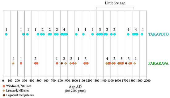 Age distribution of marine hazard events identified at Fakarava Atoll throughout the last 2000 years, based from U/Th dating of collected coral clasts in all the selected reef-rim and lagoonal reef-patch sites. The ages of occurrence of these events are compared with those obtained at Takapoto Atoll, northwestern Tuamotu, based on a similar methodological approach [60]. In both atolls, the frequency of hazard events does not exceed 3–5 per century. The blue circles refer to marine hazard events recorded from dated coral clasts in the islet deposits at Takapoto atoll.