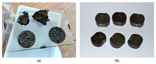 - A “plug” specimen (Figure 1b), subsampled in a plastic box, then impregnated with epoxy resin and finally dry polished by hand in order to obtain a flat surface, flawlessly suitable for EDS analyses—in this case the specimen preparation is longer (i.e., weeks), but the EDS microanalyses are extremely precise.