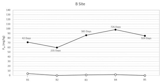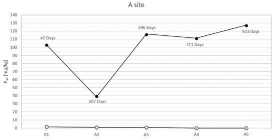 In our study cases, a second peak of bioavailable phosphorus is also observable about one year post burial (396 days PBI, concentration of Pav equal to 115.79 mg/kg) for site A and with a PBI of two years for site B (726 days PBI, concentration of 98.03 mg/kg). The results from [] showed an increase in the concentration of bioavailable phosphorus at 331 days PBI, suggesting that the pattern in the phosphorus concentration was very similar to the pattern in the present study. However, the authors concluded the experiment after only one year, hence a complete comparison of the results through a longer PBI is not possible.
