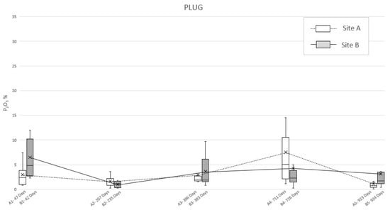 Mean phosphate concentration (P2O5) detected in “plug” soil specimens sampled from site A and B at different PBI. The box plots show the minimum value, the maximum value, the sample median, and the first and third quartiles. Data obtained from SEM-EDS analysis.