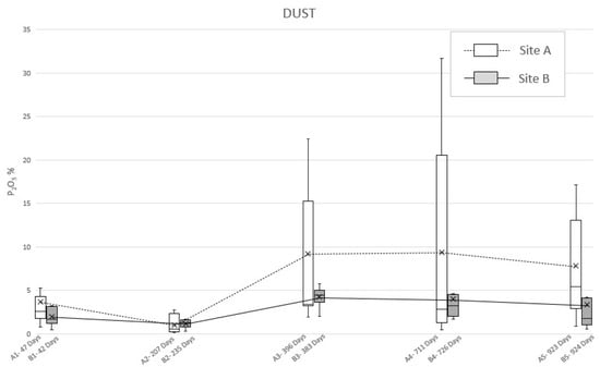 Mean phosphate concentration (P2O5) detected in “dust” soil specimens sampled from site A and B at different PBIs. The box plots show the minimum value, the maximum value, the sample median, and the first and third quartiles. Data obtained from SEM-EDS analysis.