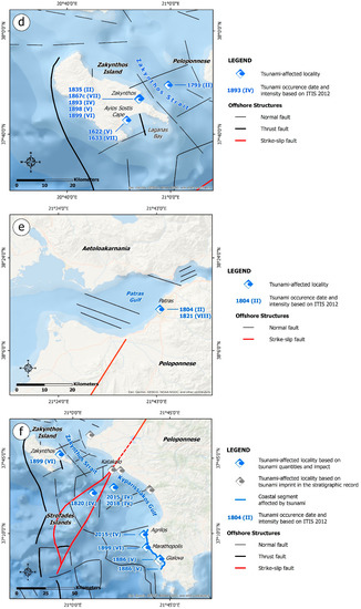 Coastal areas on the Ionian Islands and western and southern Peloponnese affected by tsunamigenic prehistoric, historical and recent earthquakes. Points and bars correspond to time periods and years with tsunami occurrence, which were identified from geo-scientific evidence in the stratigraphic record of the affected areas in the frame of the listed interdisciplinary and multiparametric studies that focused on the tsunamigenic imprint on Holocene coastal geoarchives [99,100,101,102,103,104,105,106,107,108,109,110,111,112].