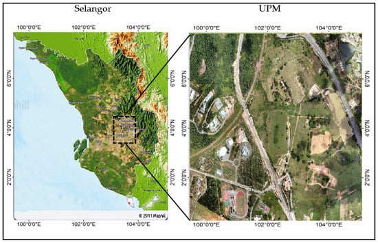 UPM is a government tertiary institution located in Serdang, Selangor (Figure 1), Malaysia. Its landmass is approximately 1108 hectares and comprises natural and artificial features, such as farmlands, trees, and water bodies. It is located along Latitude: 2°59′34.19″ N and Longitude: 101°42′16.79″ E. The climate of this area is characterized by a warm and sunny tropical rainforest climate with abundant rainfall, especially in the northeast monsoon season, between October to March. The area has an annual maximum temperature between 31 °C and 33 °C, and a minimum temperature of 22 °C and 23.5 °C. The minimum yearly rainfall is about 2600 mm, with relative dryness between June and July. Rainfall typically exceeds 133 mm (5.2 in) monthly. Figure 1 shows the location of the study area.