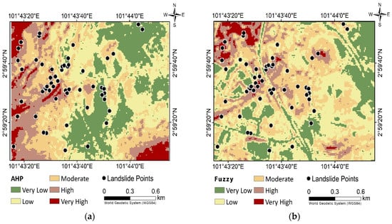 Landslide susceptibility map by (a) AHP and (b) fuzzy GAMMA overlay models.
