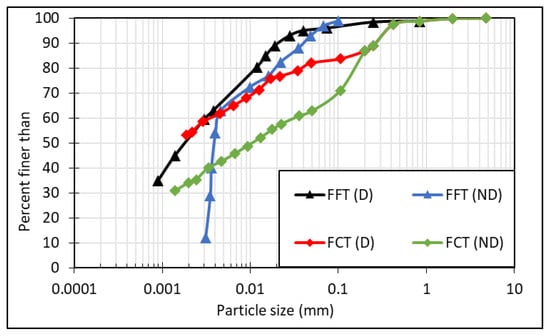 Particle size distribution and dispersed (D) and nondispersed (ND) hydrometer for the FFT and FCT samples.