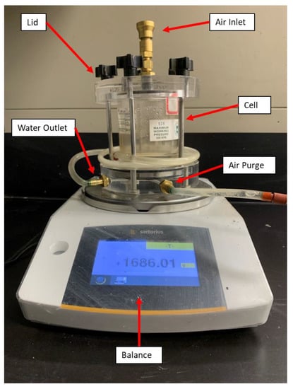 Figure 2 shows the Tempe cell device. The Tempe cell comprises three main parts: the base, Plexiglas cell (7 cm in diameter and 7 cm high), and lid. The base is fitted with a high air entry ceramic porous stone with a maximum high AEV of 500 kPa and an outlet for water release. The lid is fitted with an inlet for air pressure supply.