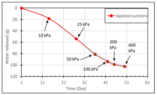 In the traditional axis translation technique [], one Tempe cell is used to measure the SWCC. The sample is confined in the cell to about three-quarters of the cell volume (about 6 cm high). Air pressure is applied over the sample, and then the water content is allowed to reach a new equilibrium when the changes in the mass of the cell become stable for 2 or more consecutive measurements at each suction step. The water released from the soil is collected at the base of the cell. Higher air pressure steps are applied until the maximum suction is reached. After the final equilibrium is reached, the lid is removed from the cell and the final water content is measured by oven-drying. This water content together with the previous changes in mass is used to back-calculate the water contents corresponding to the other suction values. The matric suctions are then plotted against their corresponding water contents to yield the SWCC. Figure 3 shows a typical graphical plot for the traditional Tempe cell technique for an FCT sample, showing the water released at each applied suction ranging from 10 kPa to 400 kPa and the time it takes to complete the test (i.e., 52 days).