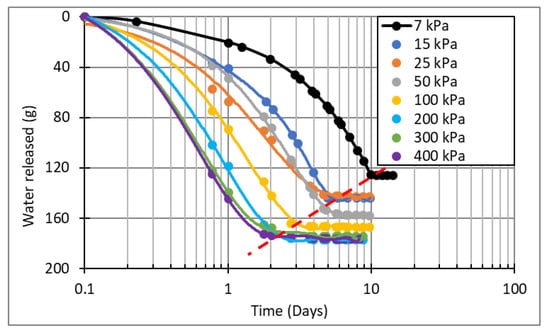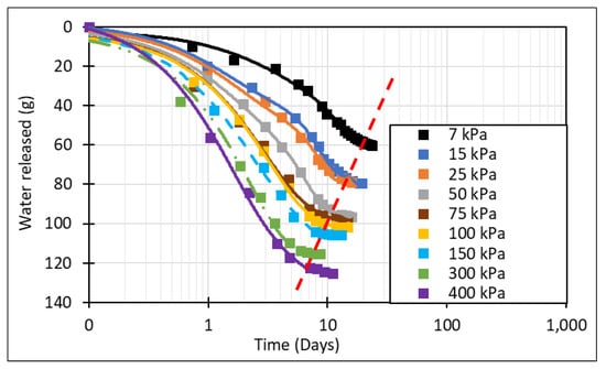 Water released from the FCT sample with time at each applied suction using the single-step Tempe cell technique. The interception of the broken line with the curves represents the points when water in the samples reaches equilibrium.