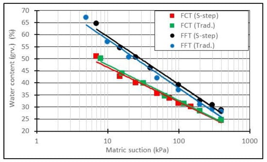 Figure 6 shows the results of the water contents of the FCT and FFT samples measured using the traditional (Trad.) and single-step (S-step) Tempe cell techniques. These data represent the early data points of the SWCC curves of the FCT and FFT samples extending from 7 kPa to 400 kPa matric suctions. The AEVs of the tested FCT and FFT samples are well beyond 400 kPa and cannot be displayed on the early curves. A comparison of the test results for the early curves shows that the two techniques yield very comparable results within experimental errors. The single-step Tempe cell technique, however, yields results about three times faster than the traditional Tempe cell technique (see Figure 3, Figure 4 and Figure 5). The single-step Tempe cell technique, however, is labor-intensive.
