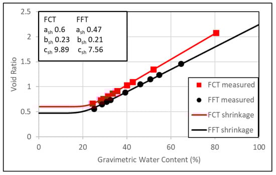 Figure 7 and Figure 8 show the shrinkage curves and the complete SWCCs for the FFT and FCT in terms of degree of saturation. The single-step Tempe cell data combined with those obtained using the glass desiccator were used in the Fredlund and Xing equation [] to fit an initial SWCC. The original and fitted data were then used to fit a shrinkage curve based on the methodology of Fredlund []. Values obtained from the shrinkage curve were then used to calculate the saturation curves.