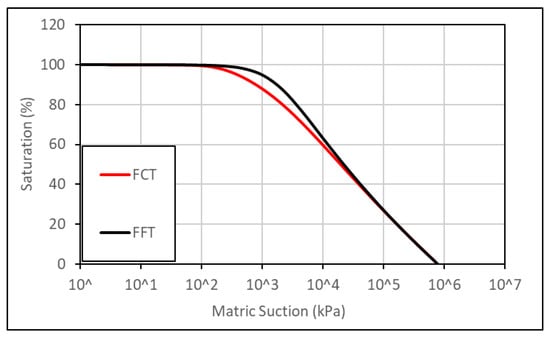 The AEVs are graphically determined from the degree of saturation curves [] and are found to be about 1000 kPa and 700 kPa for the FFT and FCT samples, respectively. The AEV of the FCT is lower than that of the FFT; this reflects the higher amount of sand in the FCT (18%) as compared to the FFT (6%). These AEV values are similar to those reported in the literature [,,]. This ascertain the ability of the single-step Tempe cell technique to provide fast estimates of SWCC and geotechnical properties.