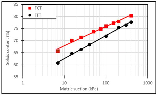 Figure 9 presents the plots of solids content as a function of matric suction (in log scale) for the FFT and FCT measured with the single-step Tempe cell technique. The samples exhibit linear solids content function trends. The FCT sample plots above the FFT sample at all matric suction values, indicating that the solids content of the FCT is greater than that of the FFT.