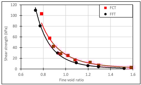 Undrained shear strength versus fines void ratio for the FFT and FCT obtained using the single-step Tempe cell technique.