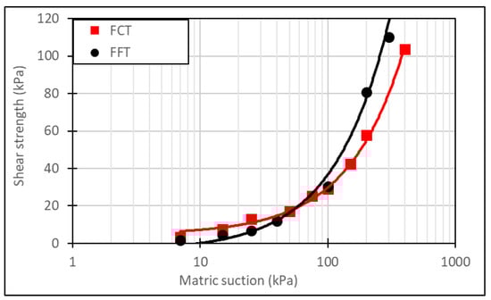 Undrained shear strength versus matric suction plots for the FFT and FCT measured with the single-step Tempe cell technique.