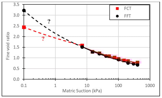 Fines void ratio versus matric suction plots for the FFT and FCT samples obtained with the single-step Tempe cell technique.