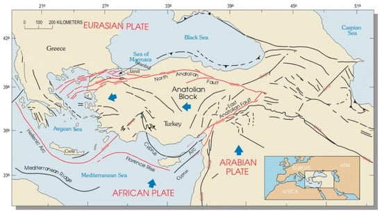 The tectonic map of Eastern Mediterranean Basin, including the North Anatolian fault, East Anatolian fault, and Hellenic and Florence trenches (by U.S. Geological Survey, National Earthquake Information Center—U.S. Geological Survey, National Earthquake Information Center, Public Domain, https://commons.wikimedia.org/w/index.php?curid=33751528 (accessed on 5 December 2022)).